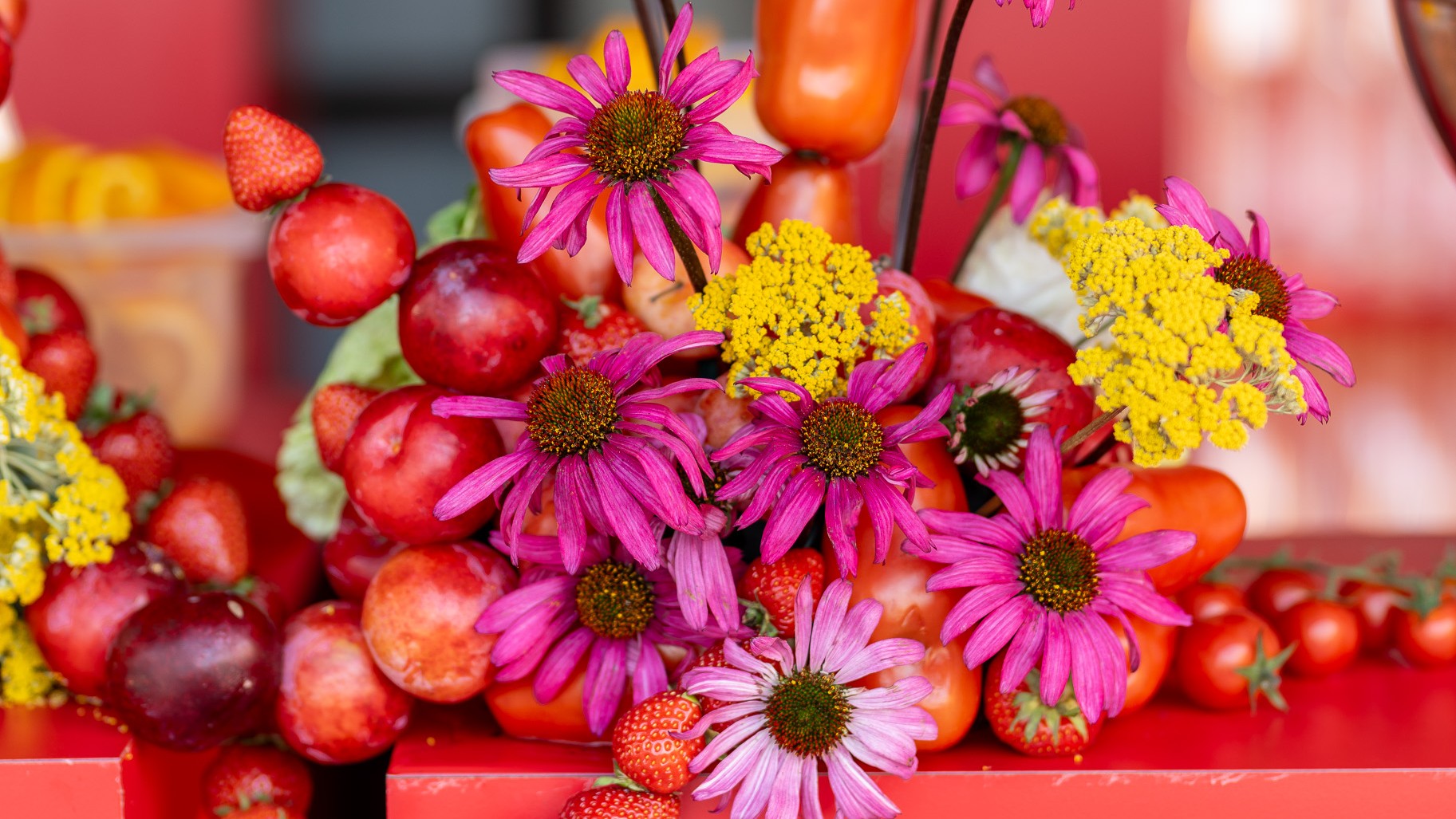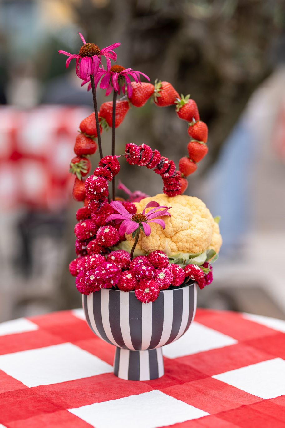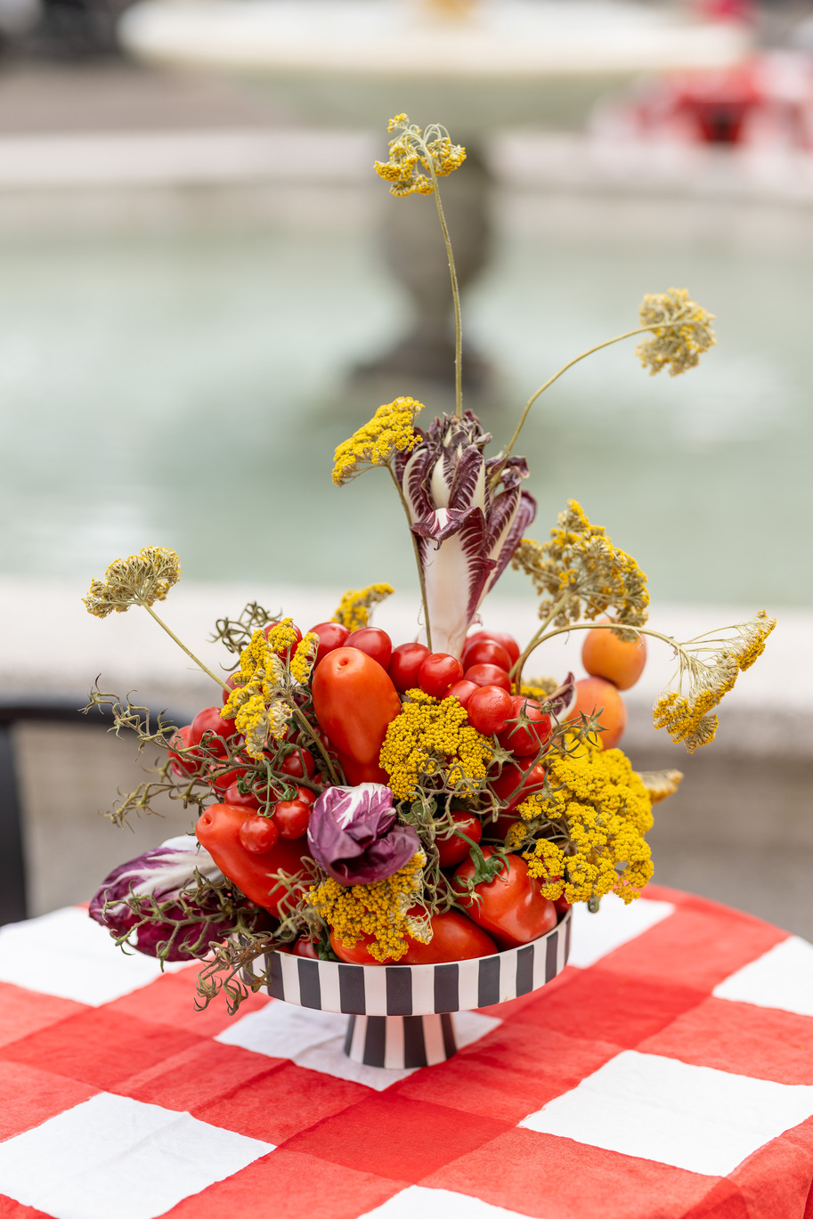 The celebration opened with a piazza party in Menaggio, where the lakeside square was fully transformed. Rachel Birthistle Studio rebranded the existing restaurants with the couple’s custom logo and a bold red-and-black palette. Building awnings were replaced to match the scheme, while tables dressed in hand-painted Italian linens were arranged in bistro-style groupings. Floral and sculptural vegetable centrepieces gave the space a surreal, celebratory tone.